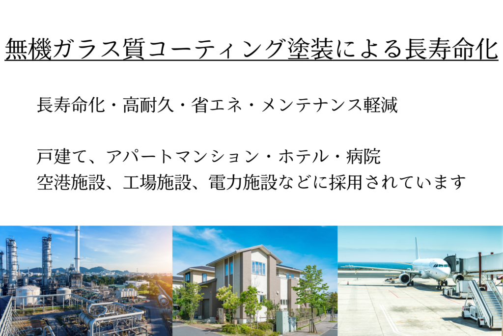 当社は、採用基準の厳しい土木分野(トンネル・道路・空港施設等)で豊富な実績のあるガラスコーティングを、一般住宅・ビルや工場の内外装など建築分野に応用することで、建築物の長寿命化や省エネに貢献します。